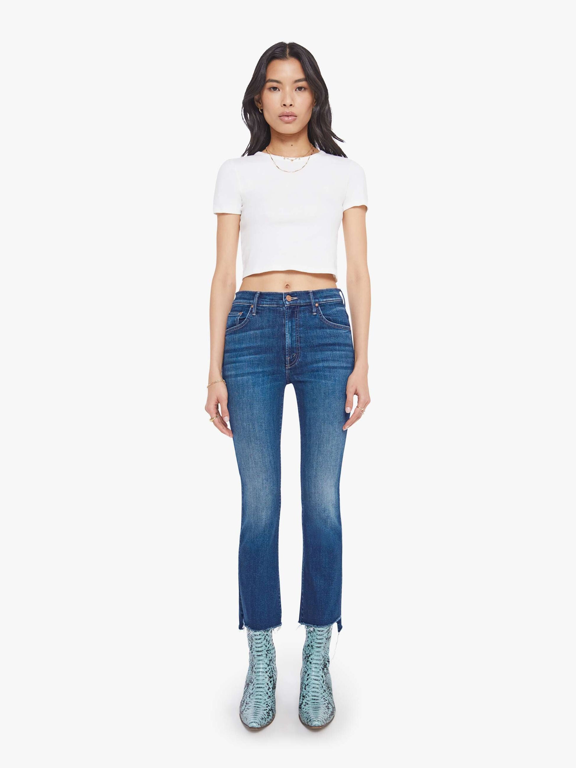 Up to no good. This iconic high-waisted bootcut has a zip fly, ankle-length inseam and a frayed step-hem. Made from a blend of recycled stretch denim, Troublemaker is a mid-blue with whiskering and fading at the knees.