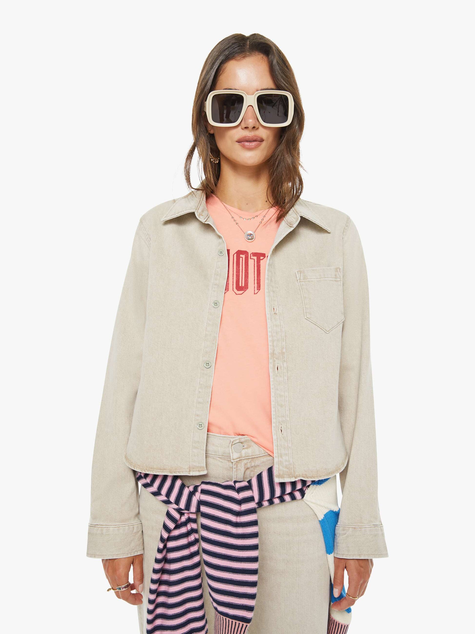A button-up denim top with a front patch pocket and a curved, cropped hem. Made from semi-rigid SUPERIOR denim, Caramel is a faded khaki with tan stitching and shell-inspired buttons.