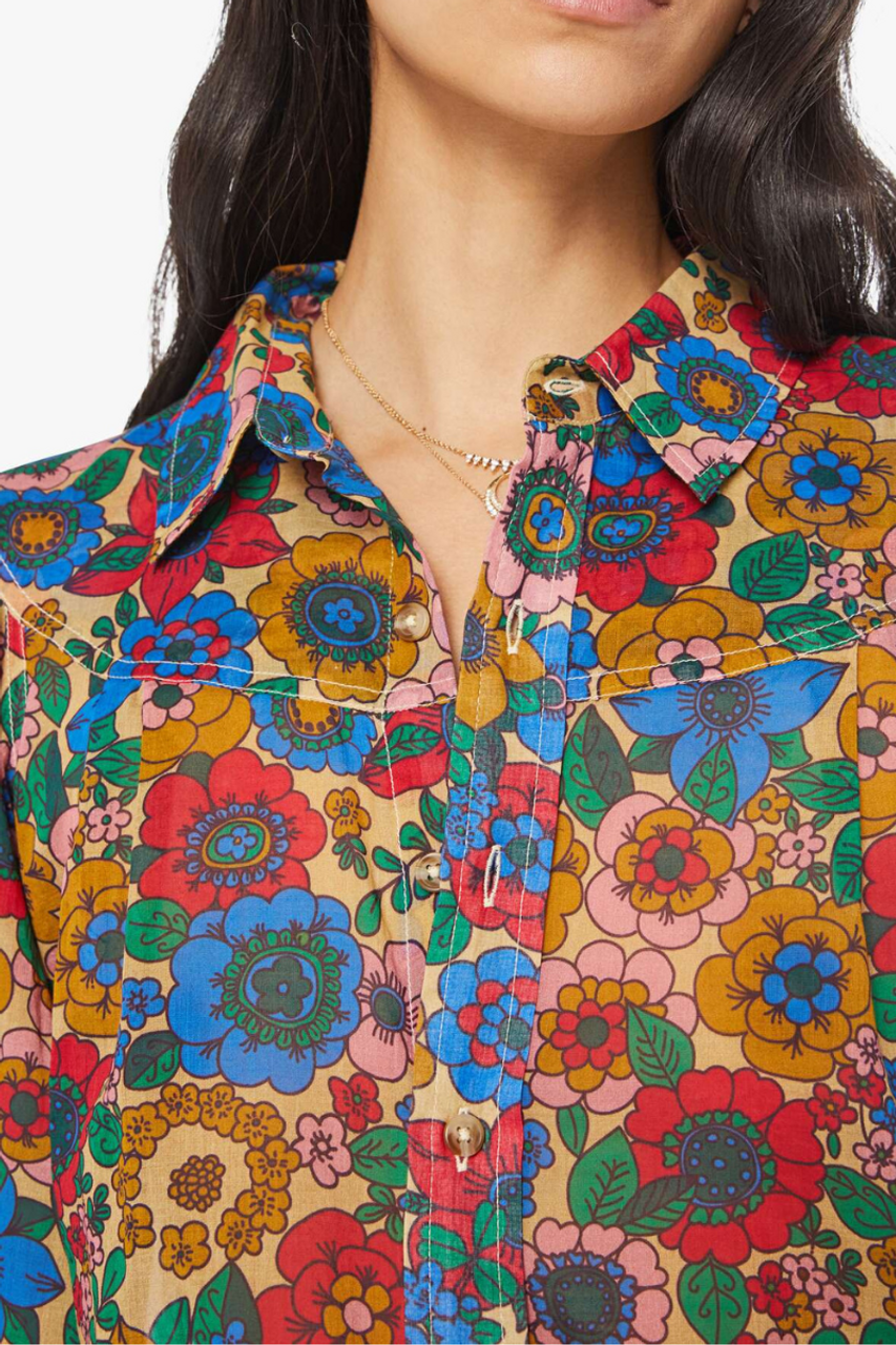A button-up blouse with a circular yoke, long balloon sleeves, snaps down the front and a curved hem. Crafted from soft stretch cotton, Track And Flower Fields is a bright floral print.