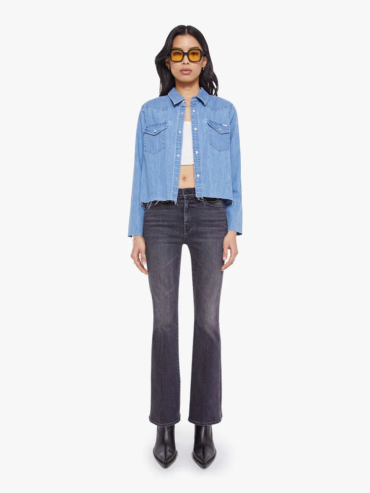 Yours for the taking. A Western-inspired denim button-up with front patch pockets and a cropped, raw hem. Made from 100% cotton, Playing For Keeps is a faded vintage-blue with faux pearl snaps down the front.