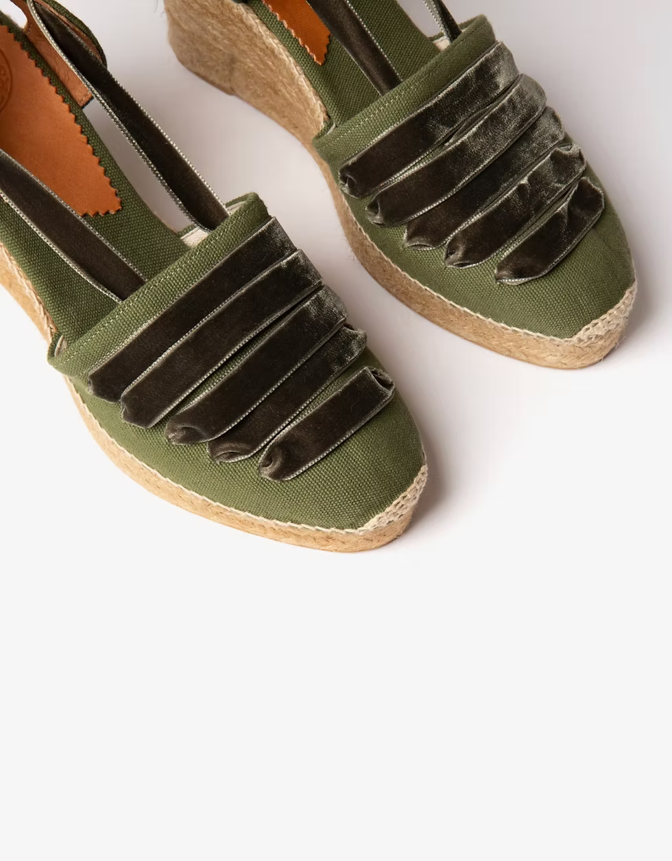 Designed on the same elegant wedge as our best-selling Scoop espadrille, the High Sevillana Dali in khaki green has the beautiful woven velvet ribbon work that is so distinctive of this story. Authentically made for us by hand in Spain, the High Sevillana has a cotton canvas front and heel keep with rustic overstitching in jute thread.